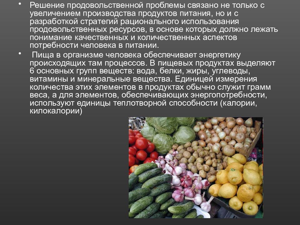 Решение продовольственной проблемы связано не только с увеличением производства продуктов питания, но и с разработкой стратегий рационального использования продовольственных ресурсов, в основе которых должно лежать понимание качественных и количественных аспектов потребности человека в питании. Пища в организме человека обеспечивает энергетику происходящих там процессов. В пищевых продуктах выделяют 6 основных групп веществ: вода, белки, жиры, углеводы, витамины и минеральные вещества. Единицей измерения количества этих элементов в продуктах обычно служит грамм веса, а для элементов, обеспечивающих энергопотребности, используют единицы теплотворной способности (калории, килокалории)