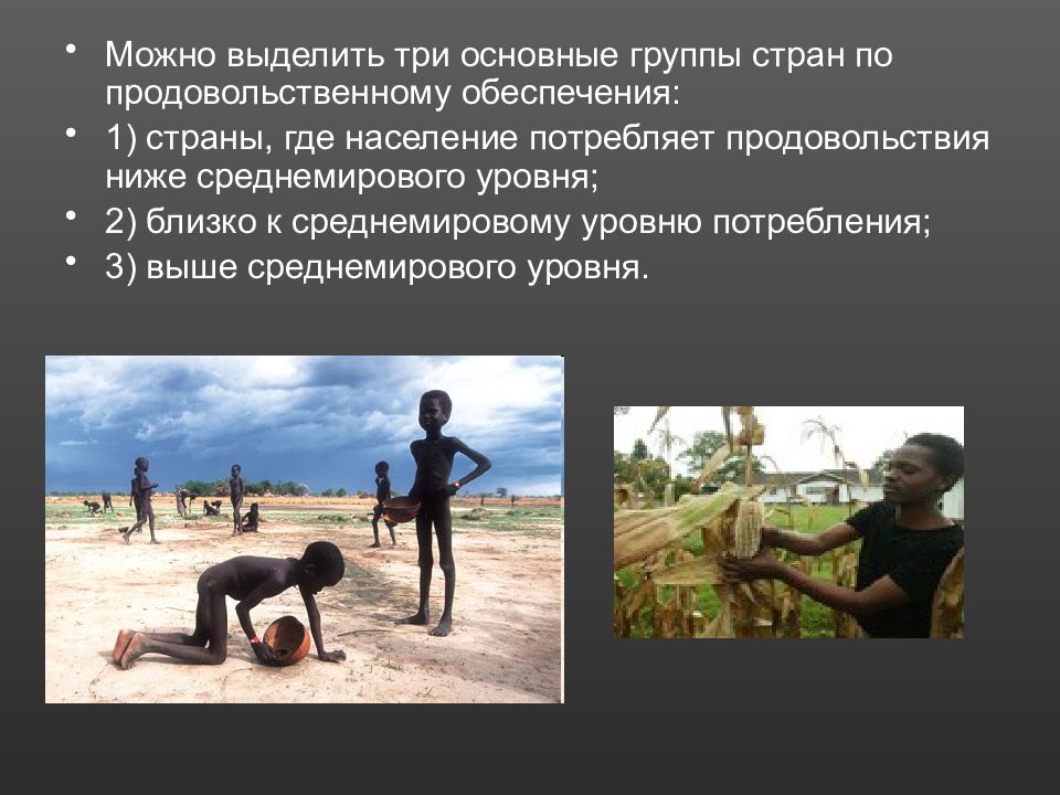 Можно выделить три основные группы стран по продовольственному обеспечения: 1) страны, где население потребляет продовольствия ниже среднемирового уровня; 2) близко к среднемировому уровню потребления; 3) выше среднемирового уровня.