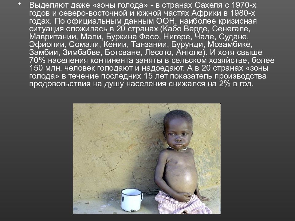 Выделяют даже «зоны голода» - в странах Сахеля с 1970-х годов и северо-восточной и южной частях Африки в 1980-х годах. По официальным данным ООН, наиболее кризисная ситуация сложилась в 20 странах (Кабо Верде, Сенегале, Мавритании, Мали, Буркина Фасо, Нигере, Чаде, Судане, Эфиопии, Сомали, Кении, Танзании, Бурунди, Мозамбике, Замбии, Зимбабве, Ботсване, Лесото, Анголе). И хотя свыше 70% населения континента заняты в сельском хозяйстве, более 150 млн. человек голодают и надоедают. А в 20 странах «зоны голода» в течение последних 15 лет показатель производства продовольствия на душу населения снижался на 2% в год.