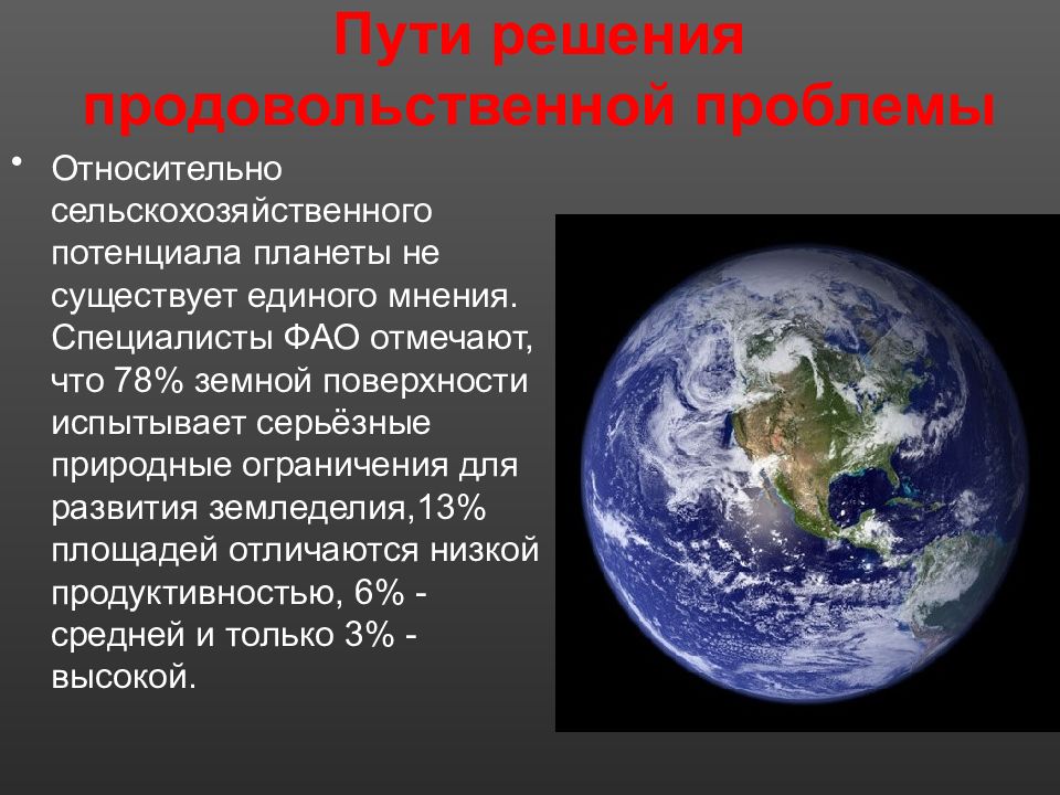 Относительно сельскохозяйственного потенциала планеты не существует единого мнения. Специалисты ФАО отмечают, что 78% земной поверхности испытывает серьёзные природные ограничения для развития земледелия,13% площадей отличаются низкой продуктивностью, 6% - средней и только 3% - высокой.