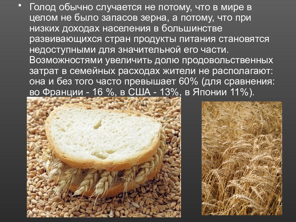 Голод обычно случается не потому, что в мире в целом не было запасов зерна, а потому, что при низких доходах населения в большинстве развивающихся стран продукты питания становятся недоступными для значительной его части. Возможностями увеличить долю продовольственных затрат в семейных расходах жители не располагают: она и без того часто превышает 60% (для сравнения: во Франции - 16 %, в США - 13%, в Японии 11%).
