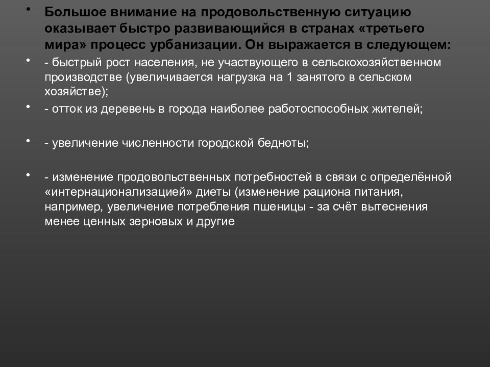 Большое внимание на продовольственную ситуацию оказывает быстро развивающийся в странах «третьего мира» процесс урбанизации. Он выражается в следующем: - быстрый рост населения, не участвующего в сельскохозяйственном производстве (увеличивается нагрузка на 1 занятого в сельском хозяйстве); - отток из деревень в города наиболее работоспособных жителей; - увеличение численности городской бедноты; - изменение продовольственных потребностей в связи с определённой «интернационализацией» диеты (изменение рациона питания, например, увеличение потребления пшеницы - за счёт вытеснения менее ценных зерновых и другие