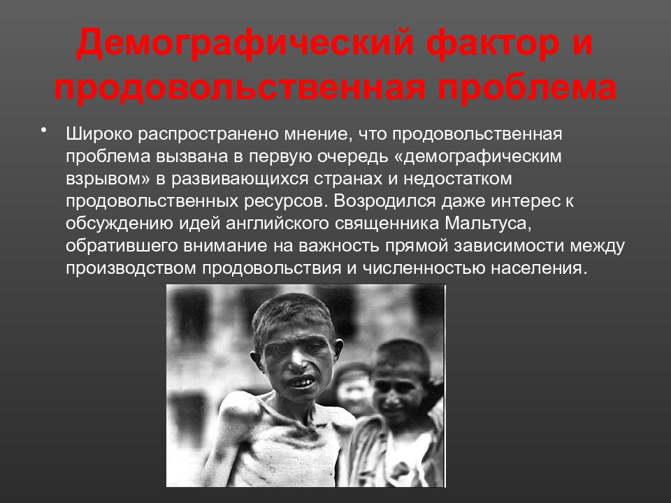 Широко распространено мнение, что продовольственная проблема вызвана в первую очередь «демографическим взрывом» в развивающихся странах и недостатком продовольственных ресурсов. Возродился даже интерес к обсуждению идей английского священника Мальтуса, обратившего внимание на важность прямой зависимости между производством продовольствия и численностью населения.