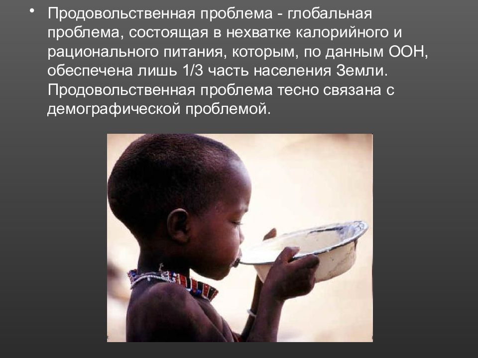 Продовольственная проблема - глобальная проблема, состоящая в нехватке калорийного и рационального питания, которым, по данным ООН, обеспечена лишь 1/3 часть населения Земли. Продовольственная проблема тесно связана с демографической проблемой.