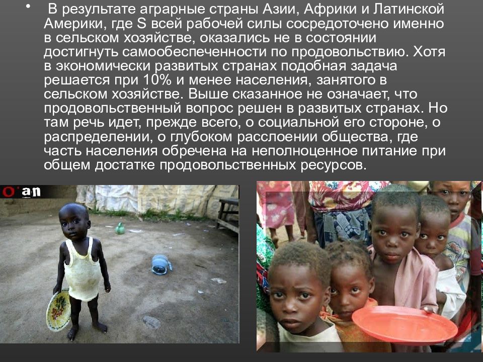 В результате аграрные страны Азии, Африки и Латинской Америки, где Ѕ всей рабочей силы сосредоточено именно в сельском хозяйстве, оказались не в состоянии достигнуть самообеспеченности по продовольствию. Хотя в экономически развитых странах подобная задача решается при 10% и менее населения, занятого в сельском хозяйстве. Выше сказанное не означает, что продовольственный вопрос решен в развитых странах. Но там речь идет, прежде всего, о социальной его стороне, о распределении, о глубоком расслоении общества, где часть населения обречена на неполноценное питание при общем достатке продовольственных ресурсов.
