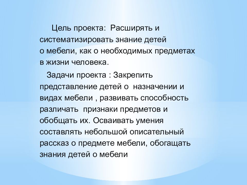 Цель проекта: Расширять и систематизировать знание детей о мебели, как о необходимых предметах в жизни человека. Задачи проекта : Закрепить представление детей о назначении и видах мебели, развивать способность различать признаки предметов и обобщать их. Осваивать умения составлять небольшой описательный рассказ о предмете мебели, обогащать знания детей о мебели