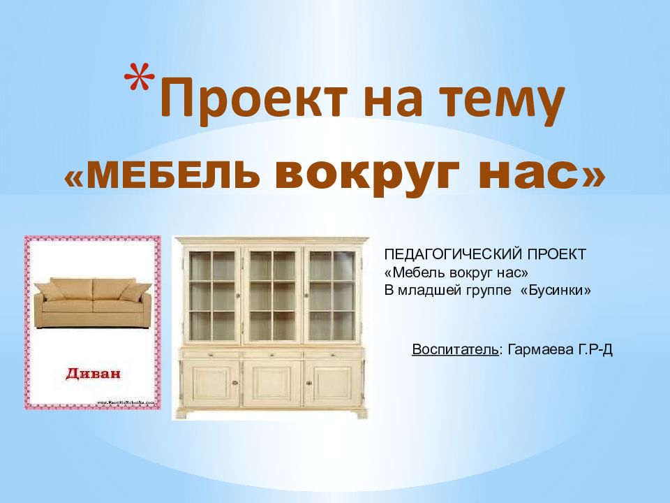 ПЕДАГОГИЧЕСКИЙ ПРОЕКТ «Мебель вокруг нас» В младшей группе «Бусинки» Воспитатель : Гармаева Г.Р-Д Проект на тему « МЕБЕЛЬ вокруг нас »