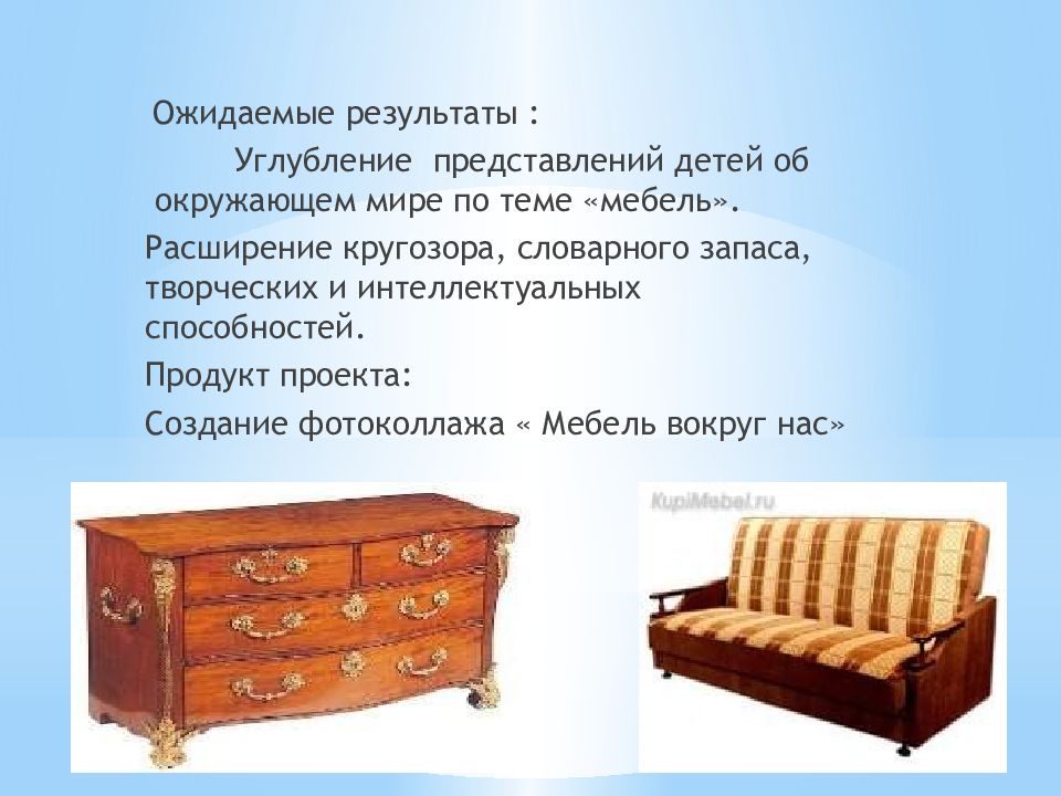 Ожидаемые результаты : Углубление представлений детей об окружающем мире по теме «мебель». Расширение кругозора, словарного запаса, творческих и интеллектуальных способностей. Продукт проекта: Создание фотоколлажа « Мебель вокруг нас»