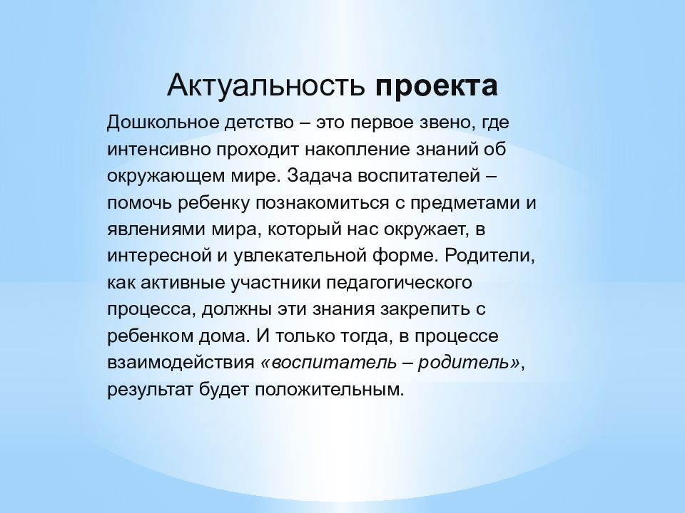 Актуальность проекта Дошкольное детство – это первое звено, где интенсивно проходит накопление знаний об окружающем мире. Задача воспитателей – помочь ребенку познакомиться с предметами и явлениями мира, который нас окружает, в интересной и увлекательной форме. Родители, как активные участники педагогического процесса, должны эти знания закрепить с ребенком дома. И только тогда, в процессе взаимодействия «воспитатель – родитель», результат будет положительным.