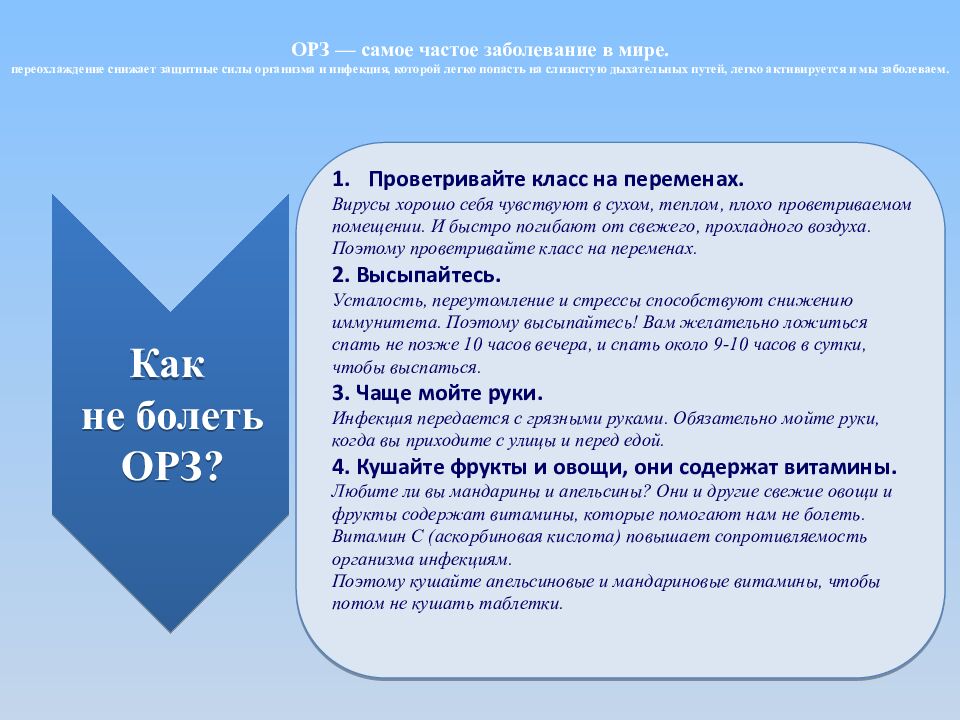 Как не болеть ОРЗ? Проветривайте класс на переменах. Вирусы хорошо себя чувствуют в сухом, теплом, плохо проветриваемом помещении. И быстро погибают от свежего, прохладного воздуха. Поэтому проветривайте класс на переменах. 2. Высыпайтесь. Усталость, переутомление и стрессы способствуют снижению иммунитета. Поэтому высыпайтесь! Вам желательно ложиться спать не позже 10 часов вечера, и спать около 9-10 часов в сутки, чтобы выспаться. 3. Чаще мойте руки. Инфекция передается с грязными руками. Обязательно мойте руки, когда вы приходите с улицы и перед едой. 4. Кушайте фрукты и овощи, они содержат витамины. Любите ли вы мандарины и апельсины? Они и другие свежие овощи и фрукты содержат витамины, которые помогают нам не болеть. Витамин С (аскорбиновая кислота ) повышает сопротивляемость организма инфекциям. Поэтому кушайте апельсиновые и мандариновые витамины, чтобы потом не кушать таблетки.