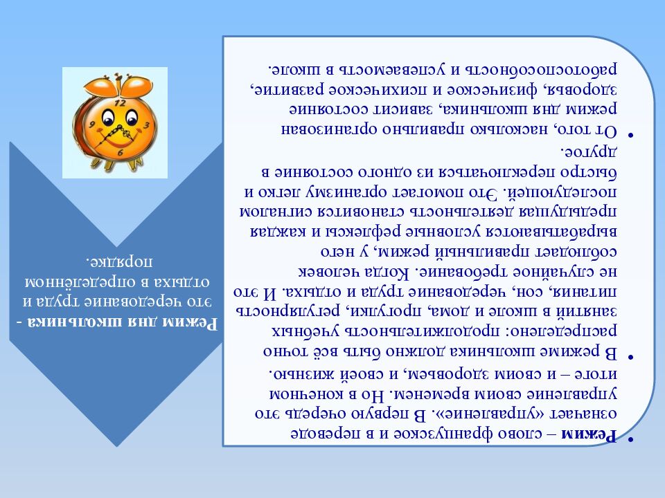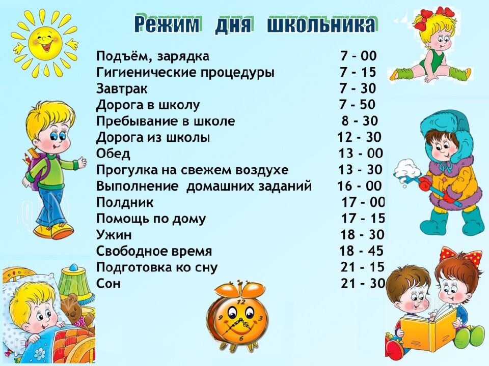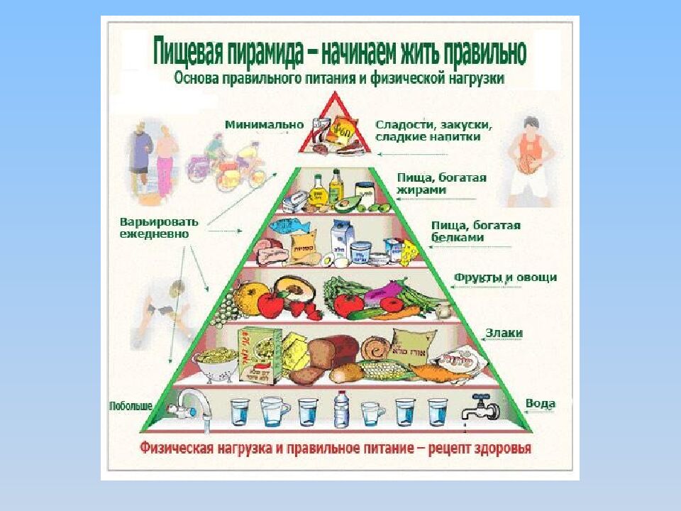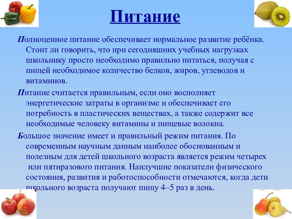 П олноценное питание обеспечивает нормальное развитие ребёнка. Стоит ли говорить, что при сегодняшних учебных нагрузках школьнику просто необходимо правильно питаться, получая с пищей необходимое количество белков, жиров, углеводов и витаминов. П итание считается правильным, если оно восполняет энергетические затраты в организме и обеспечивает его потребность в пластических веществах, а также содержит все необходимые человеку витамины и пищевые волокна. Б ольшое значение имеет и правильный режим питания. По современным научным данным наиболее обоснованным и полезным для детей школьного возраста является режим четырех или пятиразового питания. Наилучшие показатели физического состояния, развития и работоспособности отмечаются, когда дети школьного возраста получают пищу 4–5 раз в день.