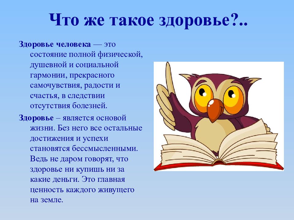 Здоровье человека — это состояние полной физической, душевной и социальной гармонии, прекрасного самочувствия, радости и счастья, в следствии отсутствия болезней. Здоровье – является основой жизни. Без него все остальные достижения и успехи становятся бессмысленными. Ведь не даром говорят, что здоровье ни купишь ни за какие деньги. Это главная ценность каждого живущего на земле.