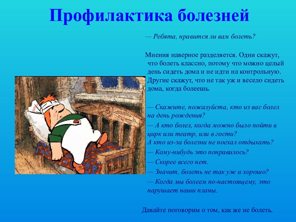 — Ребята, нравится ли вам болеть? Мнения наверное разделяется. Одни скажут, что болеть классно, потому что можно целый день сидеть дома и не идти на контрольную. Другие скажут, что не так уж и весело сидеть дома, когда болеешь. — Скажите, пожалуйста, кто из вас болел на день рождения? — А кто болел, когда можно было пойти в цирк или театр, или в гости? А кто из-за болезни не поехал отдыхать ? — Кому-нибудь это понравилось? — Скорее всего нет. — Значит, болеть не так уж и хорошо? — Когда мы болеем по-настоящему, это нарушает наши планы. Давайте поговорим о том, как же не болеть.