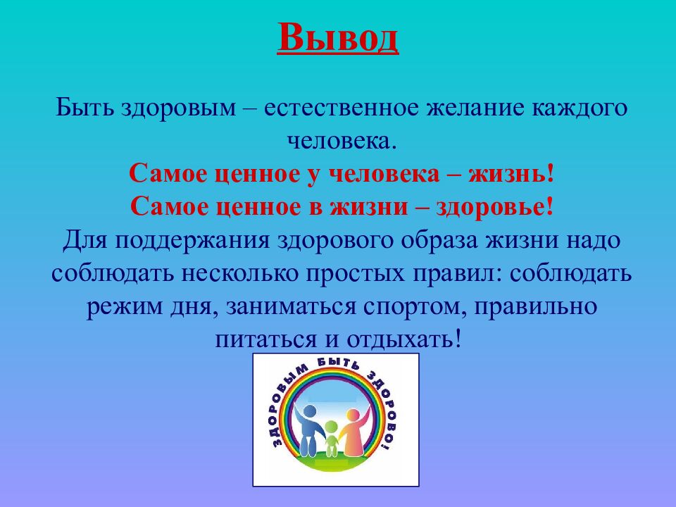 Быть здоровым – естественное желание каждого человека. Самое ценное у человека – жизнь! Самое ценное в жизни – здоровье ! Для поддержания здорового образа жизни надо соблюдать несколько простых правил : соблюдать режим дня, заниматься спортом, правильно питаться и отдыхать!
