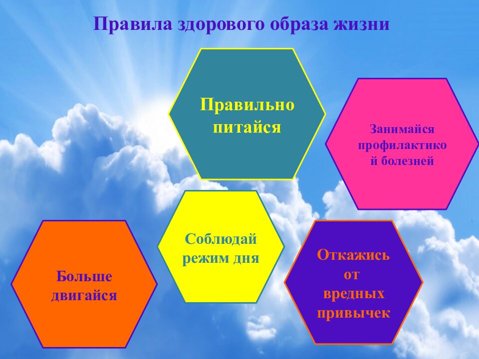 Соблюдай режим дня Правильно питайся Больше двигайся Откажись от вредных привычек Занимайся профилактикой болезней
