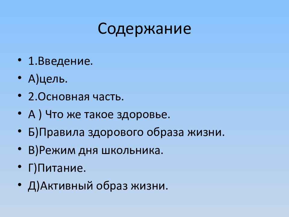 1.Введение. А)цель. 2.Основная часть. А ) Что же такое здоровье. Б)Правила здорового образа жизни. В)Режим дня школьника. Г)Питание. Д)Активный образ жизни.
