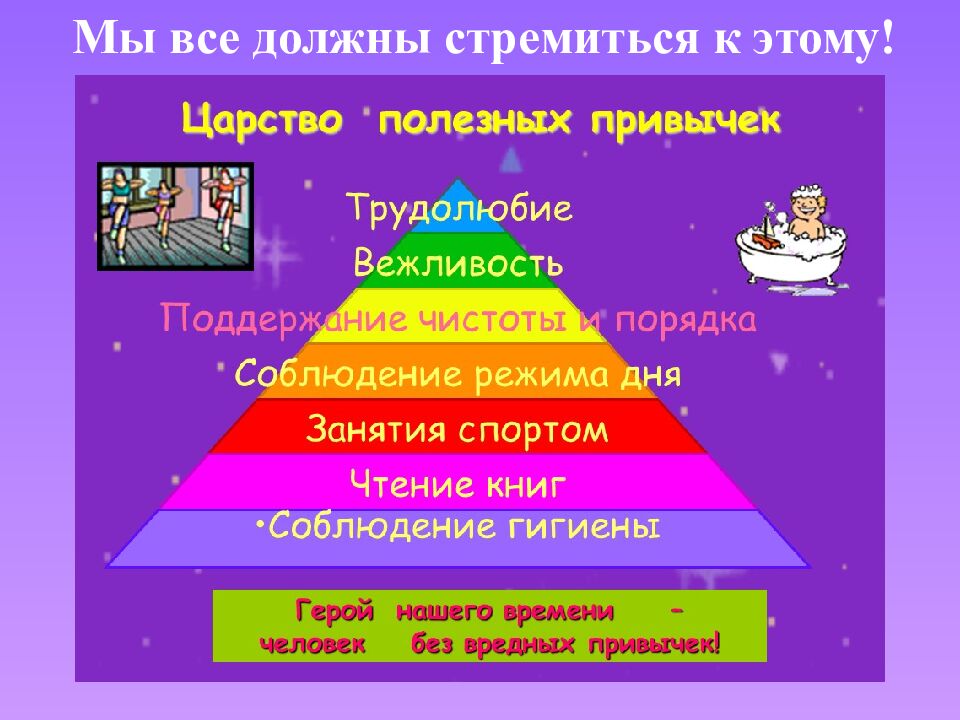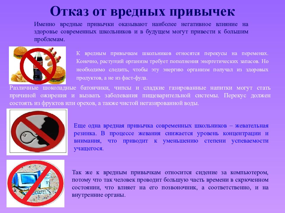К вредным привычкам школьников относятся перекусы на переменах. Конечно, растущий организм требует пополнения энергетических запасов. Но необходимо следить, чтобы эту энергию организм получал из здоровых продуктов, а не из фаст-фуда. Еще одна вредная привычка современных школьников – жевательная резинка. В процессе жевания снижается уровень концентрации и внимания, что приводит к уменьшению степени успеваемости учащегося. Различные шоколадные батончики, чипсы и сладкие газированные напитки могут стать причиной ожирения и вызвать заболевания пищеварительной системы. Перекус должен состоять из фруктов или орехов, а также чистой негазированной воды. Так же к вредным привычкам относится сидение за компьютером, потому что так человек проводит большую часть времени в скрюченном состоянии, что влияет на его позвоночник, а соответственно, и на внутренние органы. Отказ от вредных привычек Именно вредные привычки оказывают наиболее негативное влияние на здоровье современных школьников и в будущем могут привести к большим проблемам.