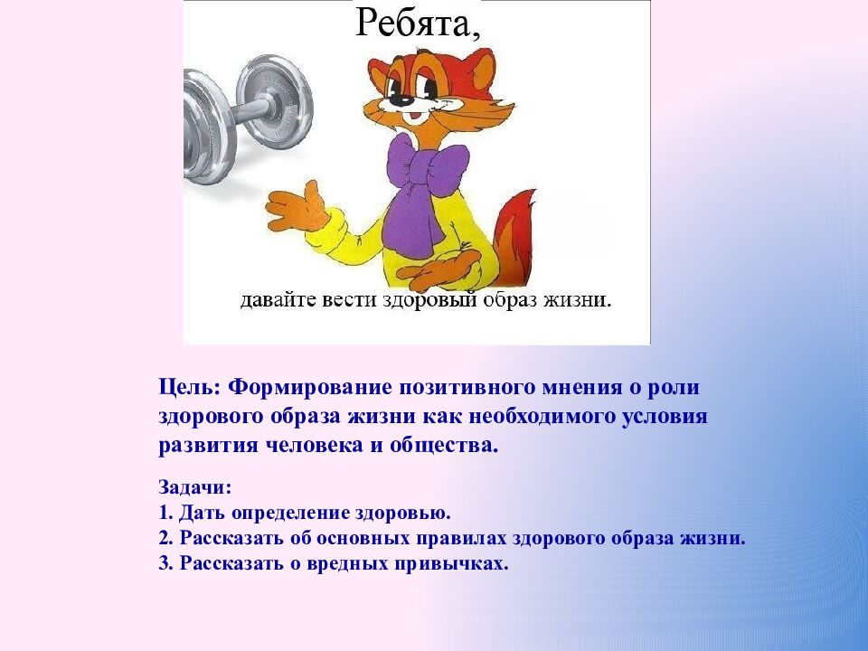 Задачи : 1. Дать определение здоровью. 2. Рассказать об основных правилах здорового образа жизни. 3. Рассказать о вредных привычках.