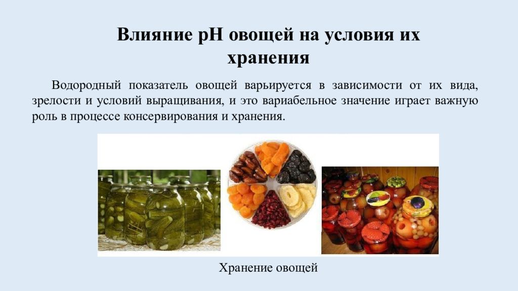 Слайд 5: Влияние pH овощей на условия их хранения