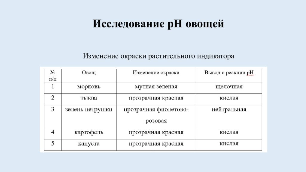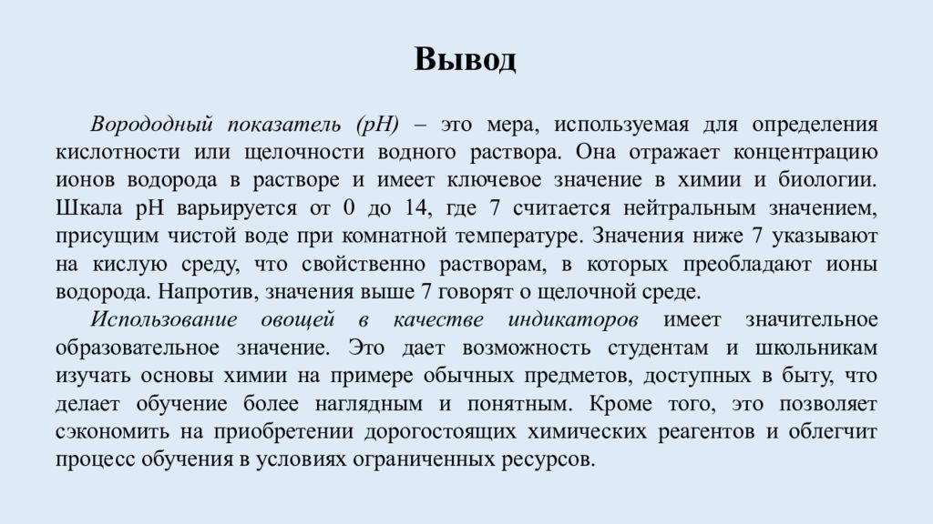 Последний слайд презентации: ПРОЕКТ по химии «Изучение ph овощей»: Вывод