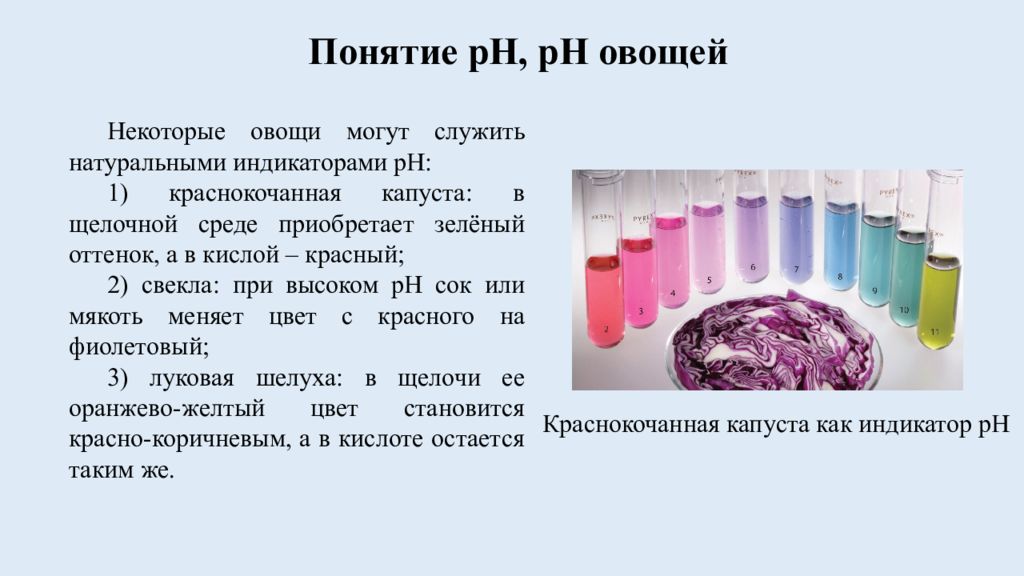 Некоторые овощи могут служить натуральными индикаторами pH : 1) краснокочанная капуста: в щелочной среде приобретает зелёный оттенок, а в кислой – красный; 2) свекла : при высоком pH сок или мякоть меняет цвет с красного на фиолетовый; 3) луковая шелуха: в щелочи ее оранжево-желтый цвет становится красно-коричневым, а в кислоте остается таким же. Краснокочанная капуста как индикатор pH