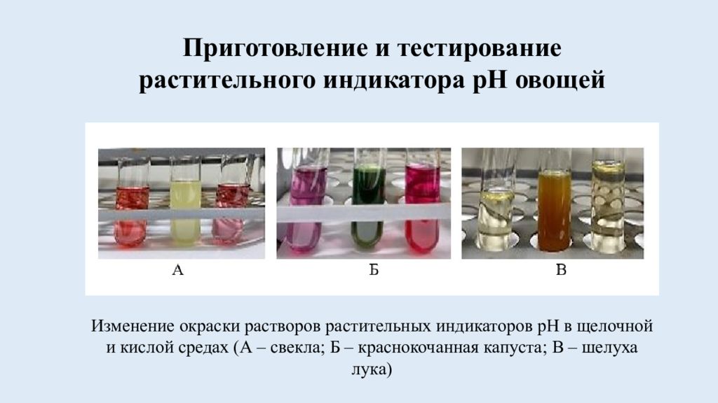 Изменение окраски растворов растительных индикаторов pH в щелочной и кислой средах (А – свекла; Б – краснокочанная капуста; В – шелуха лука)