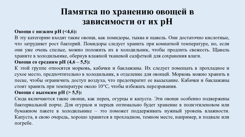 Слайд 9: Памятка по хранению овощей в зависимости от их pH