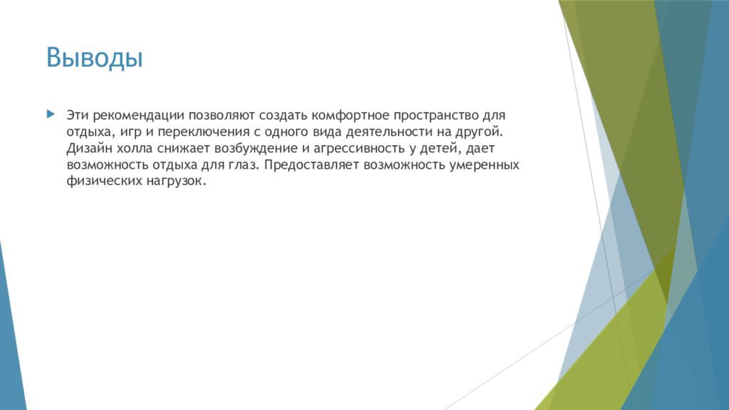 Эти рекомендации позволяют создать комфортное пространство для отды х а, игр и переключения с одного вида деятельности на другой. Дизайн холла снижает возбуждение и агрессивность у детей, дает возможность отдыха для глаз. Предоставляет возможность умеренных физических нагрузок.
