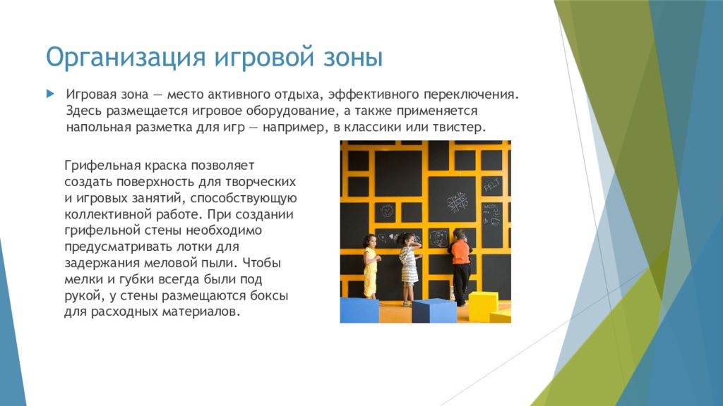 Игровая зона — место активного отдыха, эффективного переключения. Здесь размещается игровое оборудование, а также применяется напольная разметка для игр — например, в классики или твистер. Грифельная краска позволяет создать поверхность для творческих и игровых занятий, способствующую коллективной работе. При создании грифельной стены необходимо предусматривать лотки для задержания меловой пыли. Чтобы мелки и губки всегда были под рукой, у стены размещаются боксы для расходных материалов.