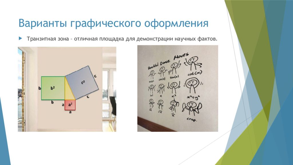Цель – Коридоры необходимо превратить в такие пространства, которые помогали бы ученикам и преподавателям отдыхать от уроков и переключаться с одного вида деятельности на другой. Оформление коридоров должно создавать положительный эмоциональный заряд, что достигается с помощью ярких цветов и приспособлений для самовыражения
