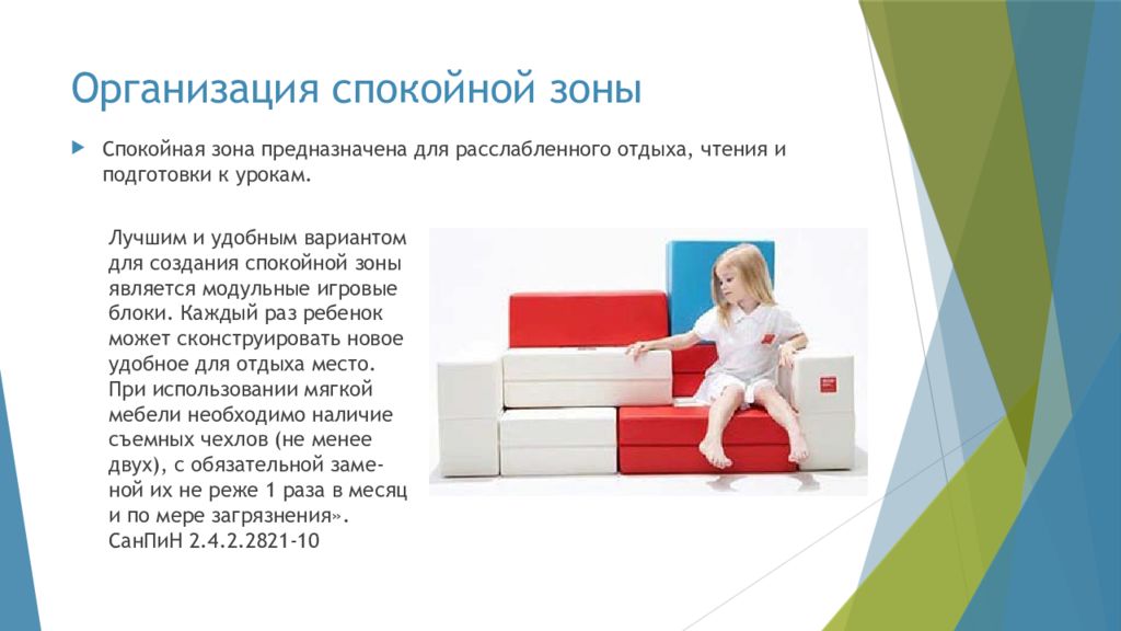 Спокойная зона предназначена для расслабленного отдыха, чтения и подготовки к урокам. Лучшим и удобным вариантом для создания спокойной зоны является модульные игровые блоки. Каждый раз ребенок может сконструировать новое удобное для отдыха место. При использовании мягкой мебели необходимо наличие съемных чехлов (не менее двух), с обязательной заме- ной их не реже 1 раза в месяц и по мере загрязнения». СанПиН 2.4.2.2821-10