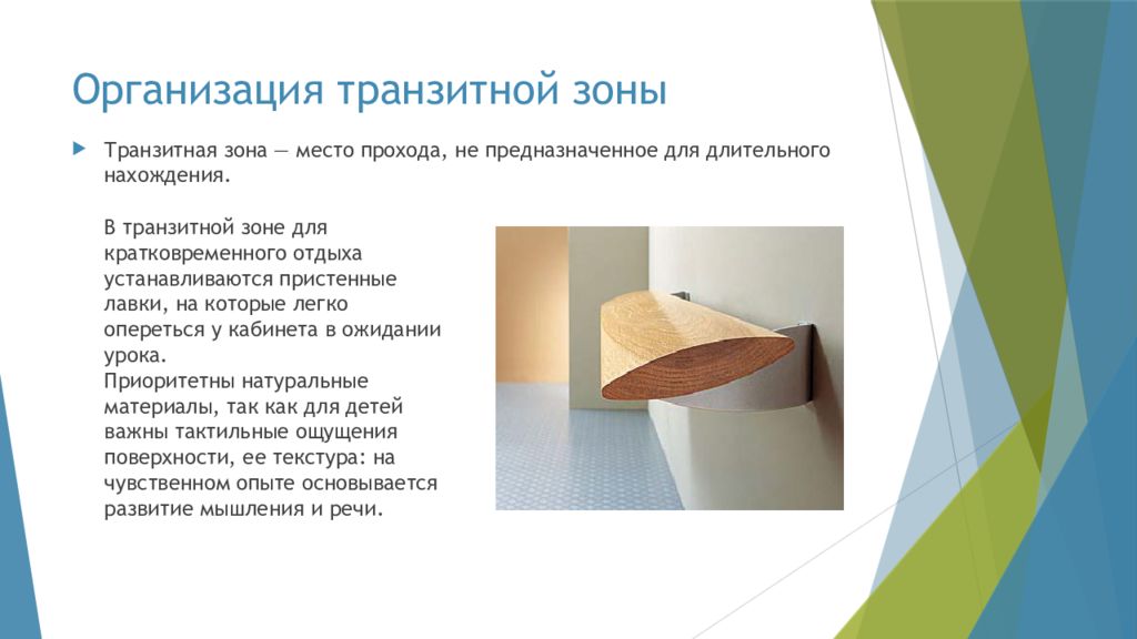 Транзитная зона — место прохода, не предназначенное для длительного нахождения. В транзитной зоне для кратковременного отдыха устанавливаются пристенные лавки, на которые легко опереться у кабинета в ожидании урока. Приоритетны натуральные материалы, так как для детей важны тактильные ощущения поверхности, ее текстура : на чувственном опыте основывается развитие мышления и речи.