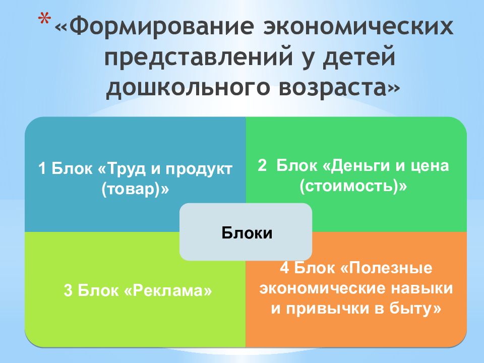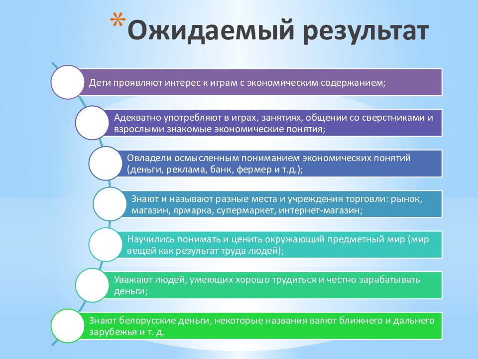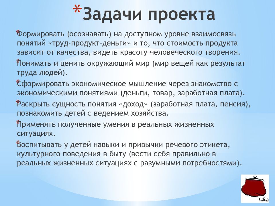 Формировать (осознавать) на доступном уровне взаимосвязь понятий «труд-продукт–деньги» и то, что стоимость продукта зависит от качества, видеть красоту человеческого творения. Понимать и ценить окружающий мир (мир вещей как результат труда людей). Сформировать экономическое мышление через знакомство с экономическими понятиями (деньги, товар, заработная плата). Раскрыть сущность понятия «доход» (заработная плата, пенсия), познакомить детей с ведением хозяйства. Применять полученные умения в реальных жизненных ситуациях. Воспитывать у детей навыки и привычки речевого этикета, культурного поведения в быту (вести себя правильно в реальных жизненных ситуациях с разумными потребностями).