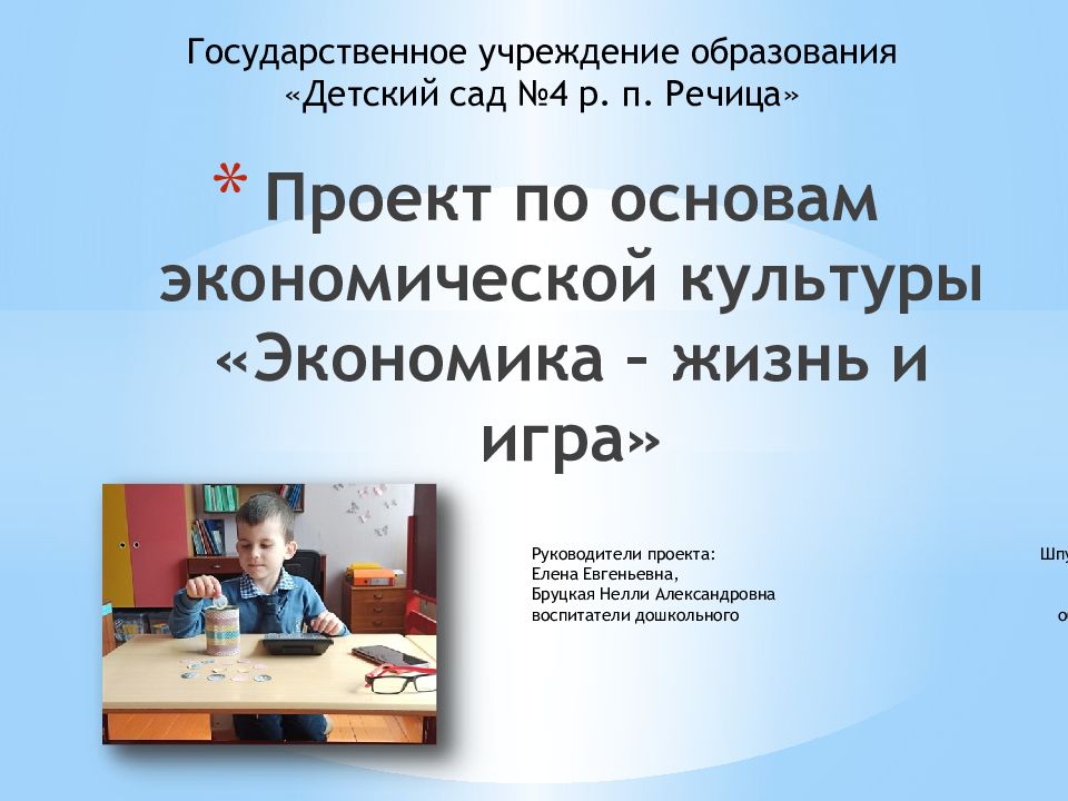 Руководители проекта: Шпудейко Елена Евгеньевна, Бруцкая Нелли Александровна воспитатели дошкольного образования Проект по основам экономической культуры «Экономика – жизнь и игра» Государственное учреждение образования «Детский сад №4 р. п. Речица»