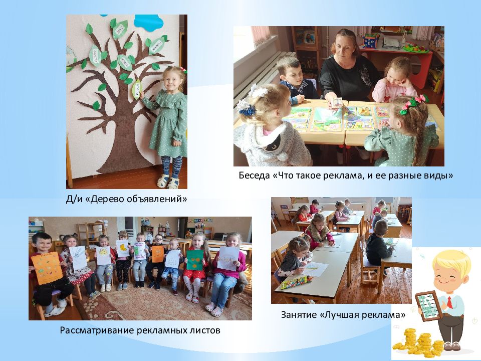 Д/и «Дерево объявлений» Рассматривание рекламных листов Беседа «Что такое реклама, и ее разные виды» Занятие «Лучшая реклама»