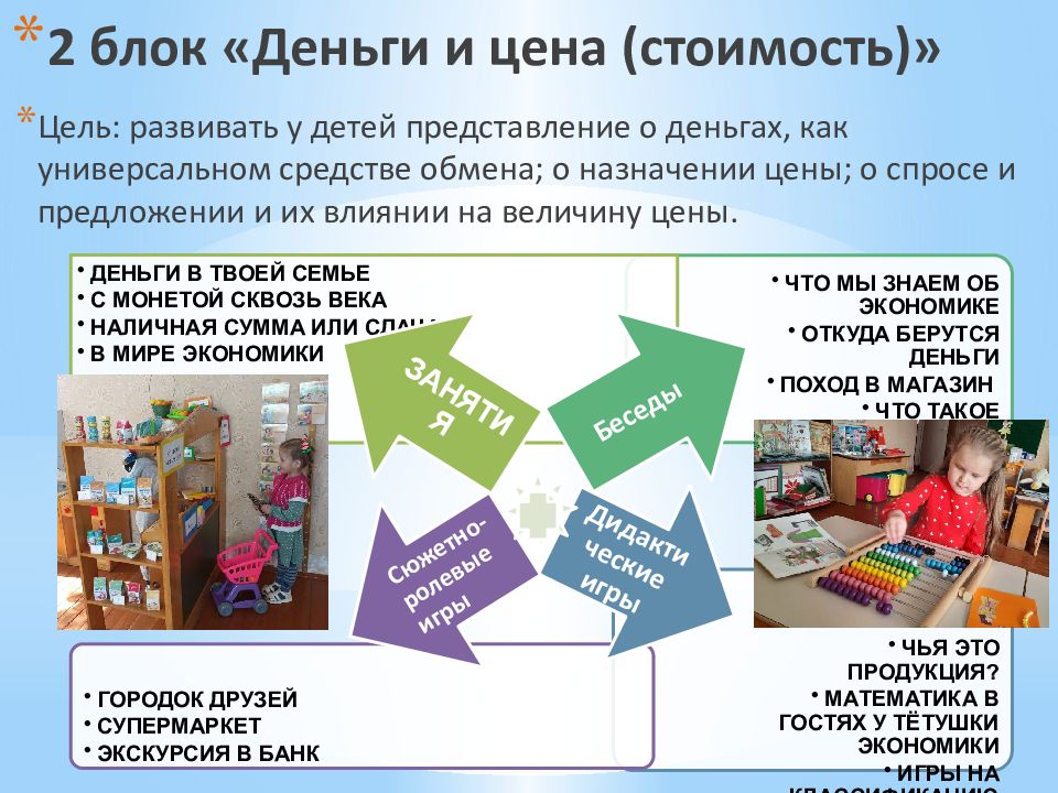 Цель: развивать у детей представление о деньгах, как универсальном средстве обмена; о назначении цены; о спросе и предложении и их влиянии на величину цены.