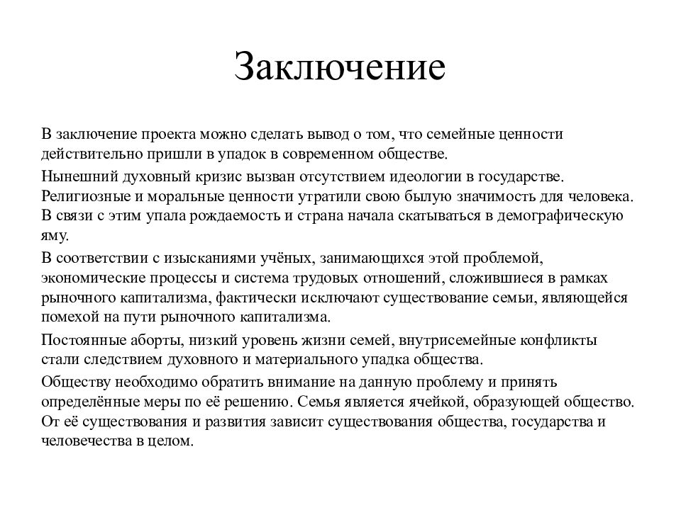 В заключение проекта можно сделать вывод о том, что семейные ценности действительно пришли в упадок в современном обществе. Нынешний духовный кризис вызван отсутствием идеологии в государстве. Религиозные и моральные ценности утратили свою былую значимость для человека. В связи с этим упала рождаемость и страна начала скатываться в демографическую яму. В соответствии с изысканиями учёных, занимающихся этой проблемой, экономические процессы и система трудовых отношений, сложившиеся в рамках рыночного капитализма, фактически исключают существование семьи, являющейся помехой на пути рыночного капитализма. Постоянные аборты, низкий уровень жизни семей, внутрисемейные конфликты стали следствием духовного и материального упадка общества. Обществу необходимо обратить внимание на данную проблему и принять определённые меры по её решению. Семья является ячейкой, образующей общество. От её существования и развития зависит существования общества, государства и человечества в целом.