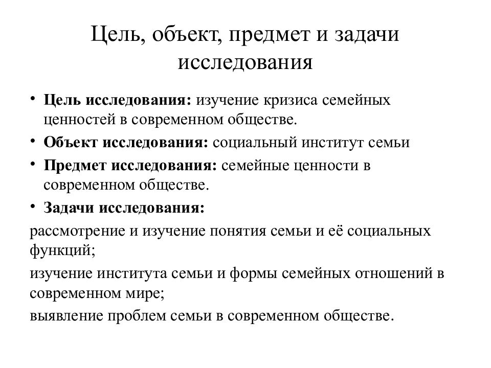 Цель исследования: изучение кризиса семейных ценностей в современном обществе. Объект исследования: социальный институт семьи Предмет исследования: семейные ценности в современном обществе. Задачи исследования: рассмотрение и изучение понятия семьи и её социальных функций; изучение института семьи и формы семейных отношений в современном мире; выявление проблем семьи в современном обществе.