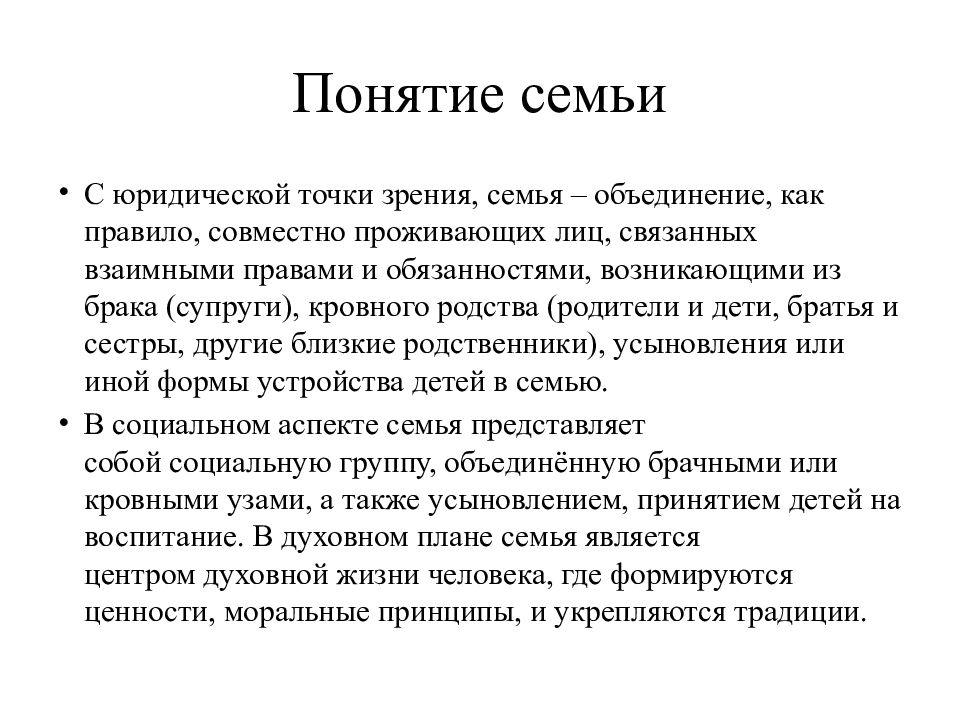 С юридической точки зрения, семья – объединение, как правило, совместно проживающих лиц, связанных взаимными правами и обязанностями, возникающими из брака (супруги), кровного родства (родители и дети, братья и сестры, другие близкие родственники), усыновления или иной формы устройства детей в семью. В социальном аспекте семья представляет собой социальную группу, объединённую брачными или кровными узами, а также усыновлением, принятием детей на воспитание. В духовном плане семья является центром духовной жизни человека, где формируются ценности, моральные принципы, и укрепляются традиции.