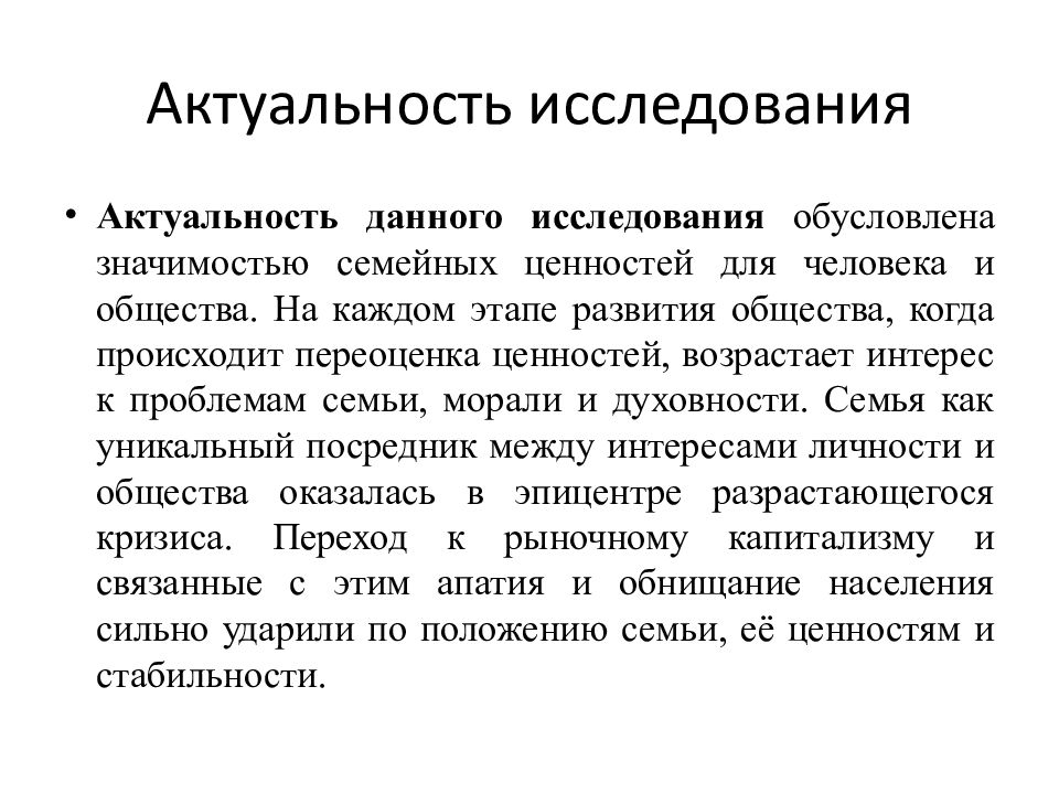 Актуальность данного исследования обусловлена значимостью семейных ценностей для человека и общества. На каждом этапе развития общества, когда происходит переоценка ценностей, возрастает интерес к проблемам семьи, морали и духовности. Семья как уникальный посредник между интересами личности и общества оказалась в эпицентре разрастающегося кризиса. Переход к рыночному капитализму и связанные с этим апатия и обнищание населения сильно ударили по положению семьи, её ценностям и стабильности.