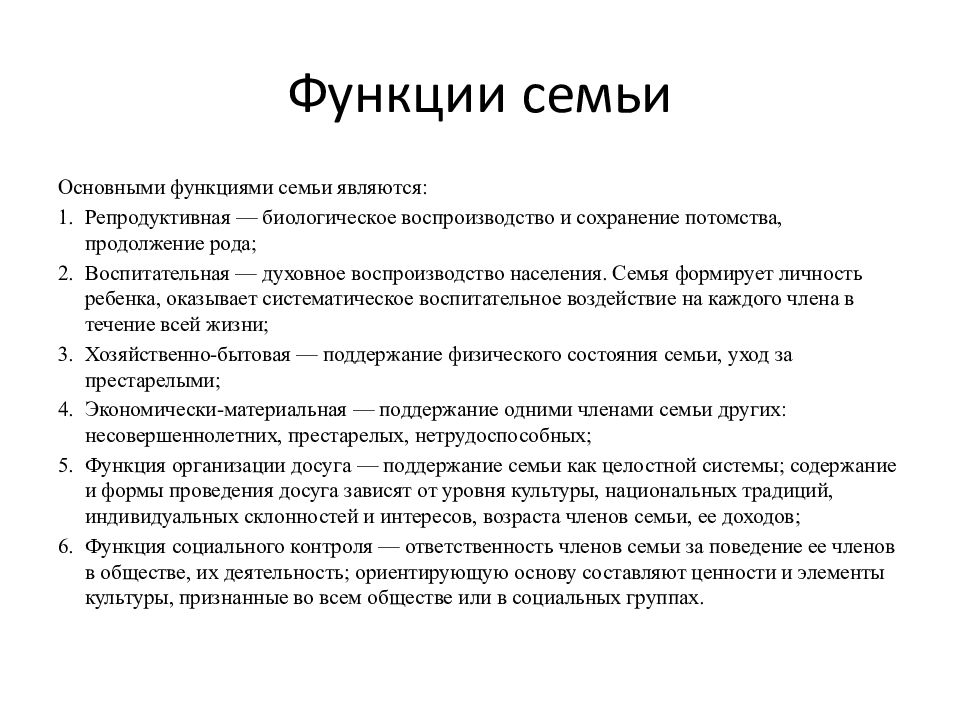Основными функциями семьи являются: Репродуктивная — биологическое воспроизводство и сохранение потомства, продолжение рода; Воспитательная — духовное воспроизводство населения. Семья формирует личность ребенка, оказывает систематическое воспитательное воздействие на каждого члена в течение всей жизни; Хозяйственно-бытовая — поддержание физического состояния семьи, уход за престарелыми; Экономически-материальная — поддержание одними членами семьи других: несовершеннолетних, престарелых, нетрудоспособных; Функция организации досуга — поддержание семьи как целостной системы; содержание и формы проведения досуга зависят от уровня культуры, национальных традиций, индивидуальных склонностей и интересов, возраста членов семьи, ее доходов; Функция социального контроля — ответственность членов семьи за поведение ее членов в обществе, их деятельность; ориентирующую основу составляют ценности и элементы культуры, признанные во всем обществе или в социальных группах.