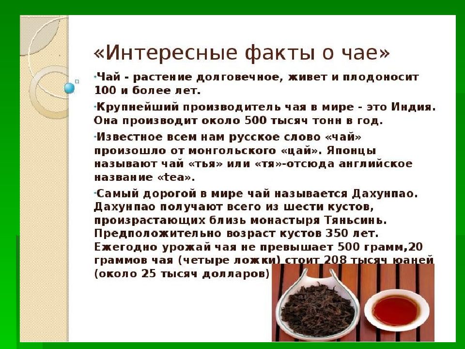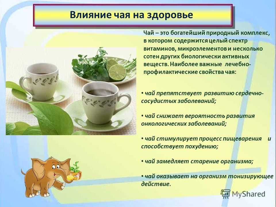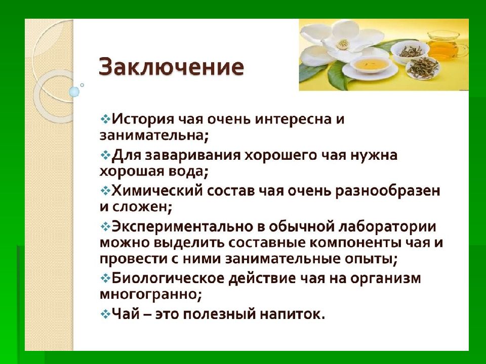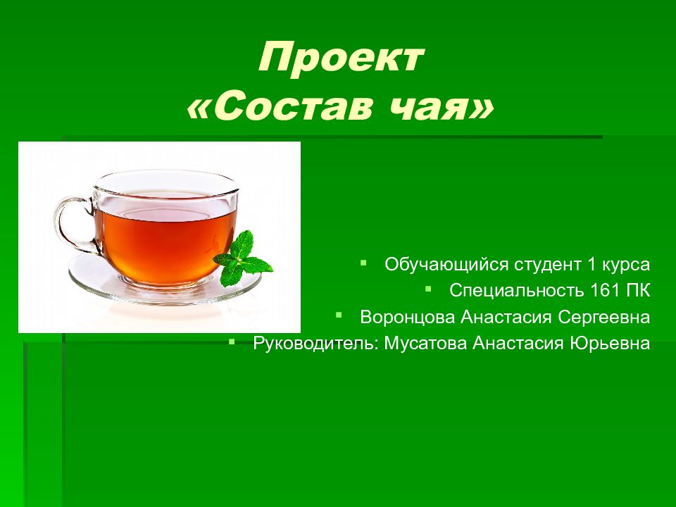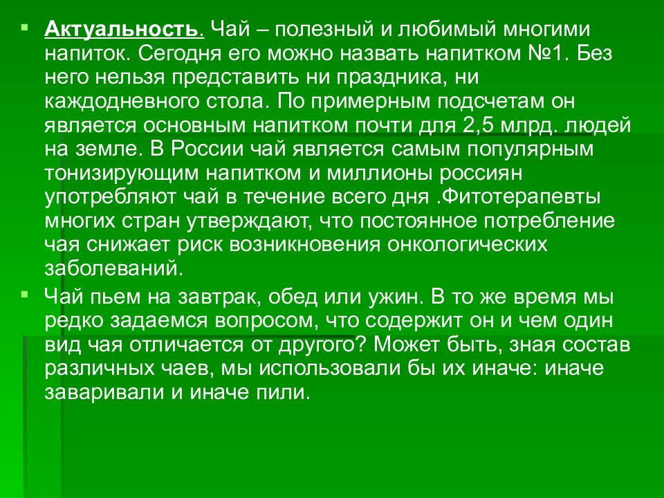 Актуальность. Чай – полезный и любимый многими напиток. Сегодня его можно назвать напитком №1. Без него нельзя представить ни праздника, ни каждодневного стола. По примерным подсчетам он является основным напитком почти для 2,5 млрд. людей на земле. В России чай является самым популярным тонизирующим напитком и миллионы россиян употребляют чай в течение всего дня.Фитотерапевты многих стран утверждают, что постоянное потребление чая снижает риск возникновения онкологических заболеваний. Чай пьем на завтрак, обед или ужин. В то же время мы редко задаемся вопросом, что содержит он и чем один вид чая отличается от другого? Может быть, зная состав различных чаев, мы использовали бы их иначе: иначе заваривали и иначе пили.