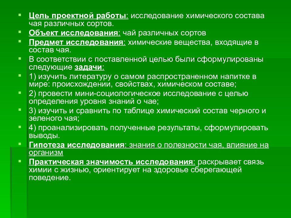 Цель проектной работы : исследование химического состава чая различных сортов. Объект исследования : чай различных сортов Предмет исследования : химические вещества, входящие в состав чая. В соответствии с поставленной целью были сформулированы следующие задачи : 1) изучить литературу о самом распространенном напитке в мире: происхождении, свойствах, химическом составе; 2) провести мини-социологическое исследование с целью определения уровня знаний о чае; 3) изучить и сравнить по таблице химический состав черного и зеленого чая; 4) проанализировать полученные результаты, сформулировать выводы. Гипотеза исследования : знания о полезности чая, влияние на организм Практическая значимость исследования : раскрывает связь химии с жизнью, ориентирует на здоровье сберегающей поведение.