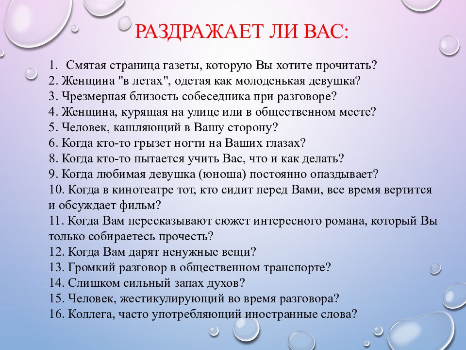 Раздражает ли Вас: Смятая страница газеты, которую Вы хотите прочитать? 2. Женщина "в летах", одетая как молоденькая девушка ? 3. Чрезмерная близость собеседника при разговоре ? 4. Женщина, курящая на улице или в общественном месте ? 5. Человек, кашляющий в Вашу сторону? 6. Когда кто-то грызет ногти на Ваших глазах ? 8. Когда кто-то пытается учить Вас, что и как делать ? 9. Когда любимая девушка (юноша) постоянно опаздывает? 10. Когда в кинотеатре тот, кто сидит перед Вами, все время вертится и обсуждает фильм? 11. Когда Вам пересказывают сюжет интересного романа, который Вы только собираетесь прочесть? 12. Когда Вам дарят ненужные вещи? 13. Громкий разговор в общественном транспорте? 14. Слишком сильный запах духов ? 15. Человек, жестикулирующий во время разговора ? 16. Коллега, часто употребляющий иностранные слова?