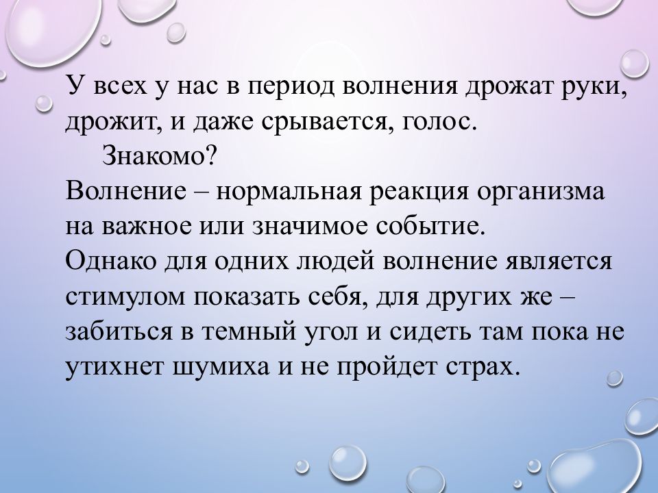 У всех у нас в период волнения дрожат руки, дрожит, и даже срывается, голос. Знакомо ? Волнение – нормальная реакция организма на важное или значимое событие. Однако для одних людей волнение является стимулом показать себя, для других же – забиться в темный угол и сидеть там пока не утихнет шумиха и не пройдет страх.