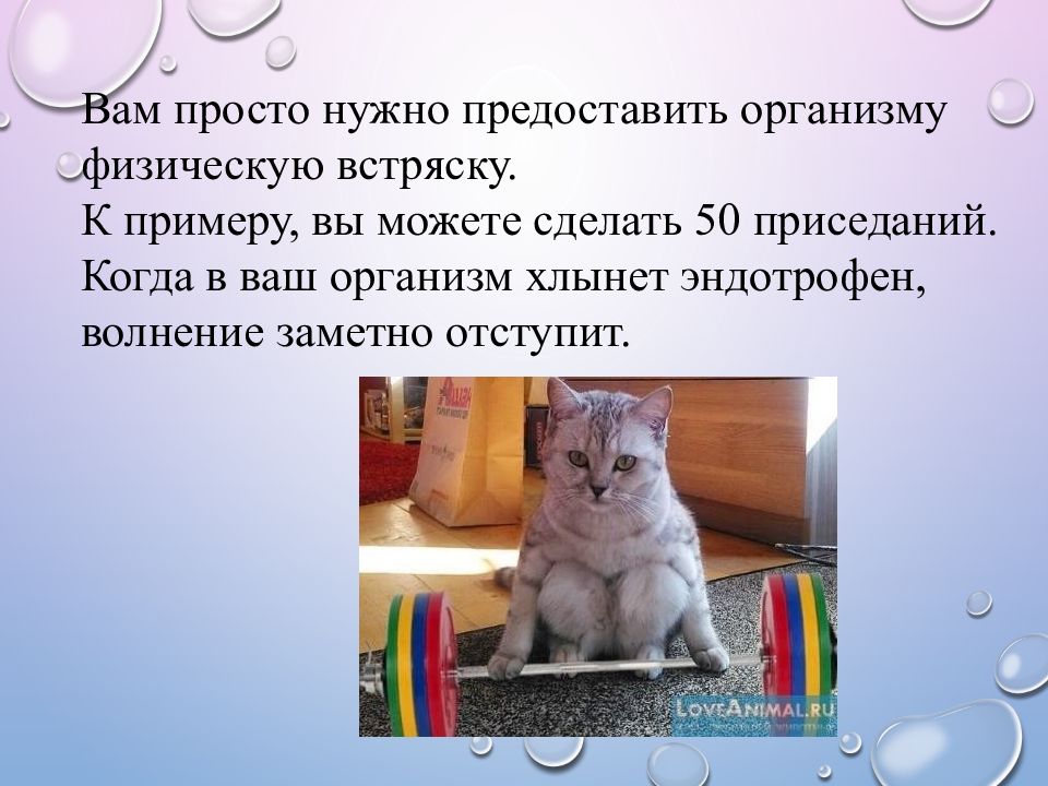 Вам просто нужно предоставить организму физическую встряску. К примеру, вы можете сделать 50 приседаний. Когда в ваш организм хлынет эндотрофен, волнение заметно отступит.