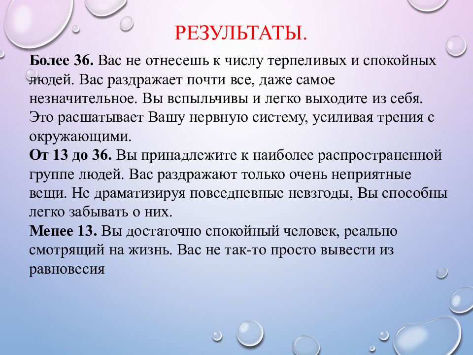 Более 36. Вас не отнесешь к числу терпеливых и спокойных людей. Вас раздражает почти все, даже самое незначительное. Вы вспыльчивы и легко выходите из себя. Это расшатывает Вашу нервную систему, усиливая трения с окружающими. От 13 до 36. Вы принадлежите к наиболее распространенной группе людей. Вас раздражают только очень неприятные вещи. Не драматизируя повседневные невзгоды, Вы способны легко забывать о них. Менее 13. Вы достаточно спокойный человек, реально смотрящий на жизнь. Вас не так-то просто вывести из равновесия