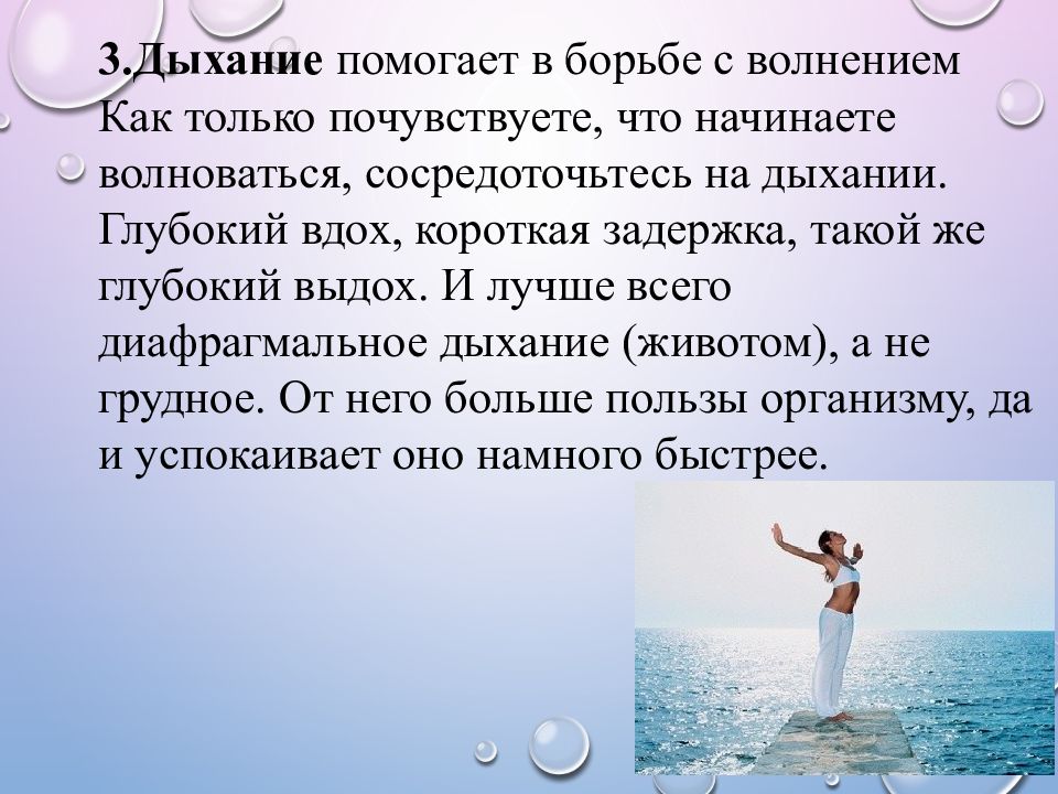 3.Дыхание помогает в борьбе с волнением Как только почувствуете, что начинаете волноваться, сосредоточьтесь на дыхании. Глубокий вдох, короткая задержка, такой же глубокий выдох. И лучше всего диафрагмальное дыхание (животом), а не грудное. От него больше пользы организму, да и успокаивает оно намного быстрее.