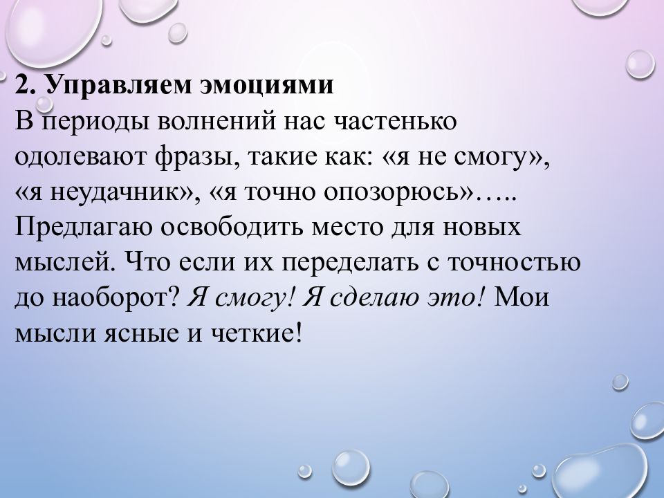 2. Управляем эмоциями В периоды волнений нас частенько одолевают фразы, такие как: «я не смогу», «я неудачник», «я точно опозорюсь »….. Предлагаю освободить место для новых мыслей. Что если их переделать с точностью до наоборот? Я смогу! Я сделаю это ! Мои мысли ясные и четкие!