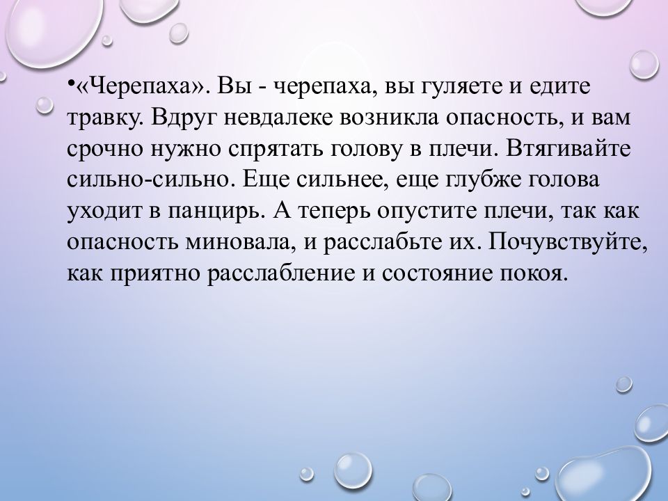 «Черепаха». Вы - черепаха, вы гуляете и едите травку. Вдруг невдалеке возникла опасность, и вам срочно нужно спрятать голову в плечи. Втягивайте сильно-сильно. Еще сильнее, еще глубже голова уходит в панцирь. А теперь опустите плечи, так как опасность миновала, и расслабьте их. Почувствуйте, как приятно расслабление и состояние покоя.